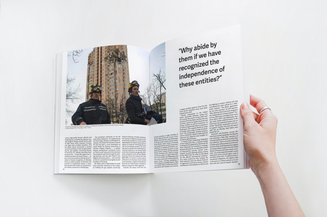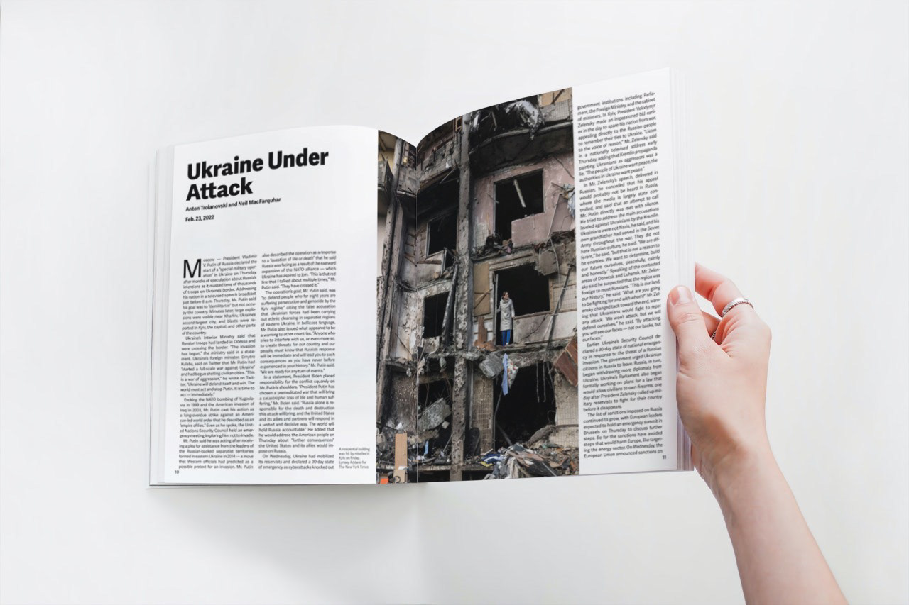 "Ukraine Under Attack" is a magazine article discussing the war in Ukraine. This magazine was a class project focusing on typography and layout design through Indesign.